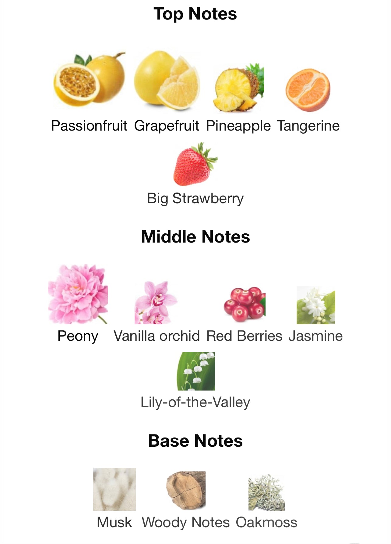 | TOP NOTES | Passionfruit, Grapefruit, Pineapple, Tangerine and Big Strawberry |